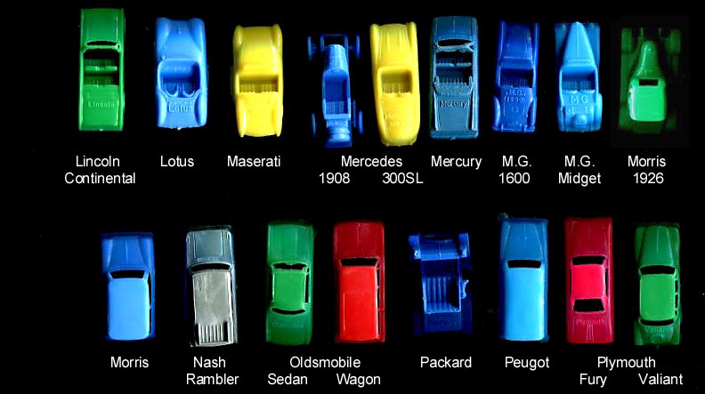 Ford 1910; 1 bright red, 3 green, 2 blue, 2 yellow.