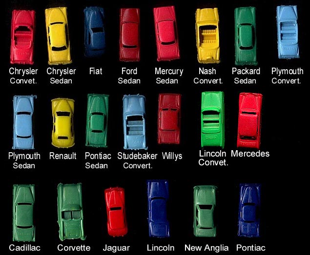 Chrysler (sedan); 1 green, 4 red, 1 silver, 1 blue, 2 yellow, 1 pink.