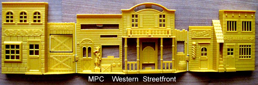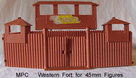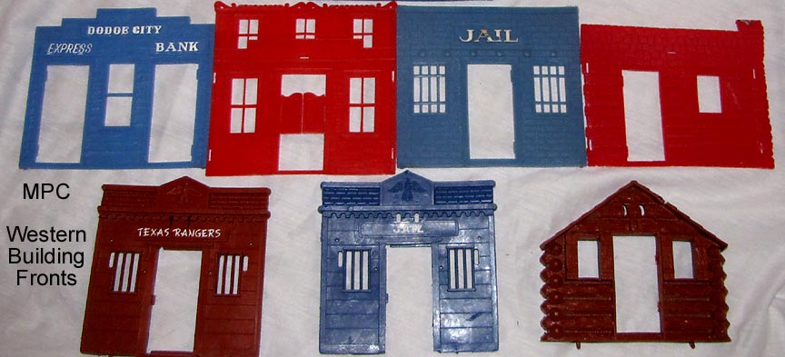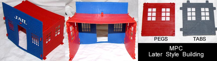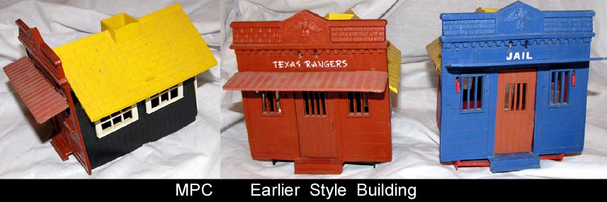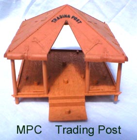 MPC made an intricate cabin for use in their western playsets. Windows and doors clipped onto the frame and at least three different front were used. These were used in their Gunsmoke playset and a few others but are scarce. The mold still exists and has been run to include with later "Marx" Fort Apache playsets. MPC switched to a simpler, cheaper building which is easier to find.