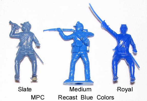 The above photo is of RECAST figures (circa 2003). Most original MPC 45mm Cavalry were made in metallic blue (a few in gray as ACW rebs). Earlier RECASTS (circa 1990)can be found in a stiff light blue plastic.