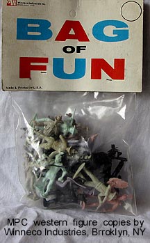 - 25.00 Winneco copies of MPC cowboys and Indians header card bag, circa 1965-75, about 15-20 figures.