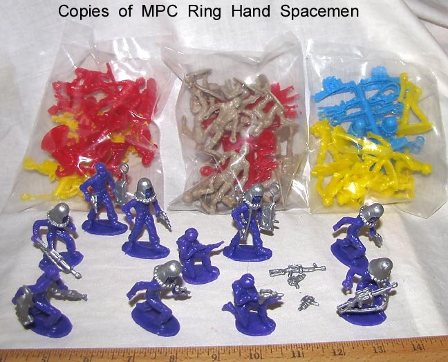 In order to keep up with the competition MPC made a set of more realistic armymen for their ring hand series. They were better detailed than the "generic" earlier figures and much more popular with kids. They were made in green for armymen, blue for Marines, Navy, or Air Force personnel, gold as spacemen and a series of bright colors (such as hot pink!) to perhaps grab the attention of small children. The kneeling figure was made with two base styles; elongate and oval shaped as can be seen to the below. In later years the mold was revised to make the bases smaller to perhaps use less plastic.
