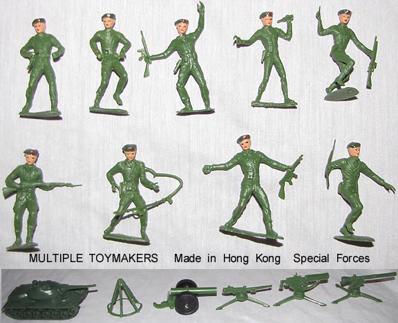 Tanks are marked Multiple Toymakers made in Hong Kong and are roughly 1/72 scale. Figures with plug in heads and other accessories 1/32. Look like Vietnam War Special Forces to us.