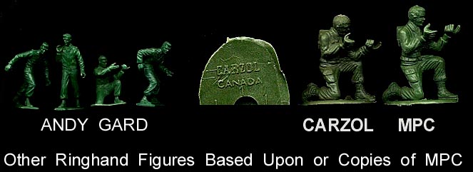 The Andy Gard 54mm figures are often mistaken for MPC figures. What we have for sale will be found in the "All Other Vintage USA Made" sales list. They are the same size as MPC & Carzol. A company known as CARZOL in Canada copied the later MPC military ringhand poses. Not very common. Each is marked Carzol and has a mold cavity number under the base.