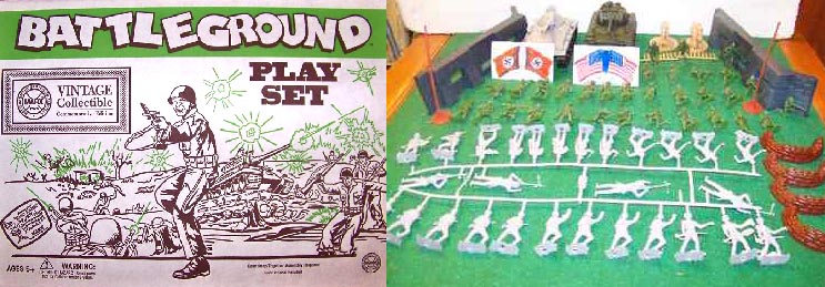 New Marx C0 1990s Battleground commemorative set. Only Marx pieces in the set are the two space cannons (German nebelwefers??). The 60 figures and both pillbox fronts were made from ex MPC molds so we list the set here. Also included are Sherman & Tiger II tanks made by BMC, two balsa gliding airplanes and some generic accessories from perhaps Hong Kong. Comes in a nice box and would make a good Christmas present.