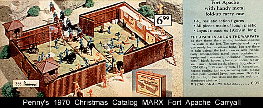 SORRY SOLD - Fort Apache Carryall circa 1970. Has metal case with hard plastic towers & ladders + a vacuform building. These sets would come with a set of nine mounted 7th cavalry and either the ten figure Ft Apache pioneers or the sixteen figure foot 7th cavalry + one 16 piece set of Indians with totem pole. We have included BOTH the Ft Apache pioneers and foot 7th cavalry for 35 defenders and a SECOND set of Indians + ALL FOUR revised poses for a total of two totem poles and 34 Indians. Plus 13 horses, cannon and stockade accessories (dipwell broken and no pot on sticks for cookfire). Case is in superior condition, A GREAT BUY.