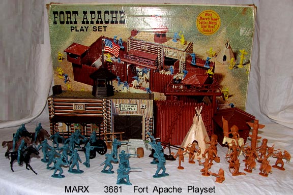 SORRY SOLD - Fort Apache 3681 Playset NO INSTRUCTIONS OR BOX DIVIDERS. Photo box one corner split and crayon on the backside. Tin building has all plastic parts (hooks off of porch). Redbrown fort; gate with two doors, 6 walls, 2 walls with ledges, 2 "L" walls, 2 scaling ladders & two 2pc guard towers may be a put together job. Two complete sets of 10 pioneers in aqua blue + One 16 pc set of Indians with revised poses in caramel. Four cavalry horses + one Indian pony. Shell shooting cannon (NO SHELLS) + 10 piece outdoor accessory group & 2 piece teepee in flesh. Nice lot of stuff.
