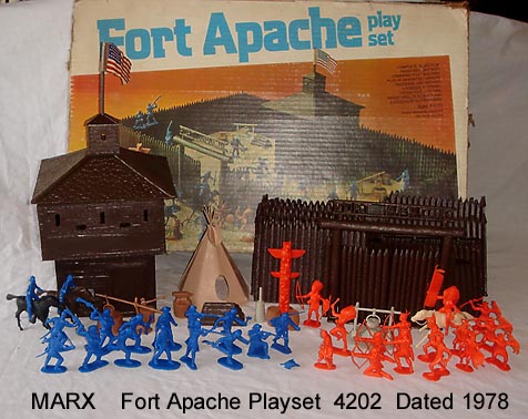 SORRY SOLD - Marx Fort Apache 4202 from 1978. Has box and nice 7 piece brown hard plastic blockhouse with matching brown hard plastic stockade; gate with 2 doors, 11 walls no ledges, 4 walls with ledges. One set of 10 hard plastic outside accessories making 8 assemblies. Box says 30 cavalry and Indians. It had one 16 piece set of totem pole and 15 Indians, one set of 10 Ft.Apache/Alamo pioneers (turkey man's turkey broken off) + 6 duplicates for a total of 31 figures. Also one 2 piece teepee, one Indian pony & 2 cavalry horses & paper US flag. Box had divider.