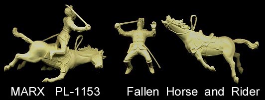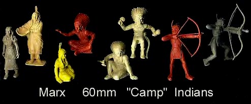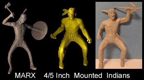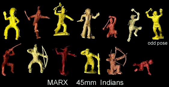 With the exception of the "odd pose" the other 12 Indian poses seen above made up the early sets. Later sets also had the "odd pose", man holding scalp and tomahawk. We do not know if this meant an earlier pose was deleted or if the mold was altered. Also the man kneeling was supposed to be using a paddle, but Marx decided to remove the paddle to avoid putting a canoe in every set. Some early examples sometimes have part of the paddle shaft as seen above. Without the paddle he becomes a drummer using one of the small accessory sprue pieces.