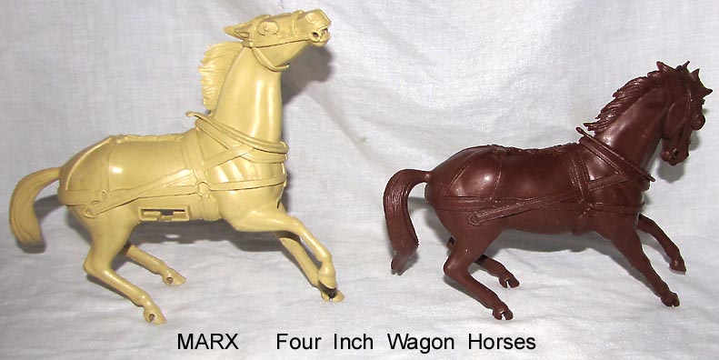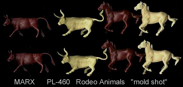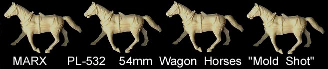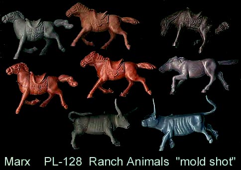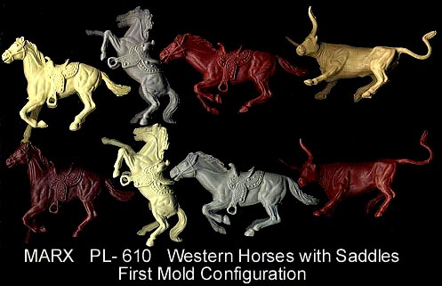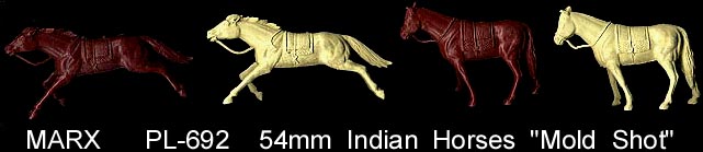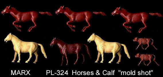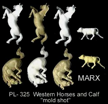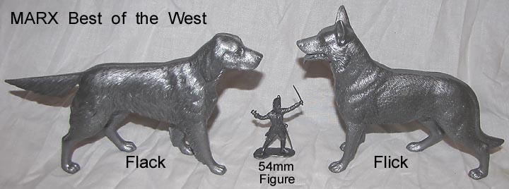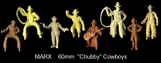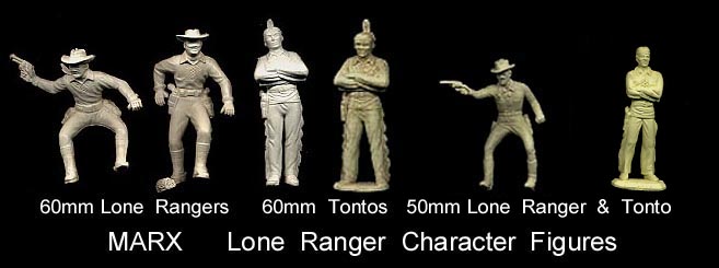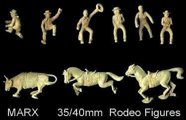 Marx made Roy Rogers playset figures in both 60mm (older) and 54mm scales. The earliest 60mm figures are made of a rubber like vinyl and do not have bases. There were two foot and one mounted pose of Roy made in 60mm. The two 60mm foot Roys and the 60mm Pat Brady are harder to find as they were not included in every playset. The 54mm figures were later and not made in nearly the amount as the 60mm figures. The 54mm Dale Evans, Pat Brady, and Bullet have their names under their bases (belly) while none of the 60mm figures are marked.