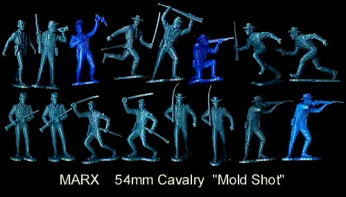 Some of the poses are copies of Marx figures which added to the speculation that they were made by Marx. We do not know who made them but we do know it was not Marx. There are nine different figures in the set. They are about 54mm in size and were made in white and cream colors.
