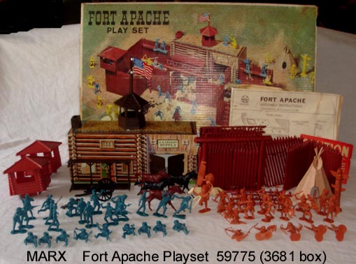 SORRY SOLD - Marx Fort Apache set 59775 circa 1967. 59775 label covers box number which is 3681. This is the harder to find transition set where Marx went from the Ft.Apache/Alamo pioneers to the new 7th Cavalry figures. The older sets came with two sets of 10 Ft.Apache/Alamo pioneers for a total of twenty figures. This transition set gets one set of 16 foot 7th cavalry + 1 set of 9 mounted 7th cavalry for a total of 25 figures. The set also has one 16 piece set of Indians with totem pole like the earlier sets, but it also had 5 extra Indians for a total of 1 totem pole and 20 Indians. The older version only needed 4 horses and although this version needs 9 only 4 were included. So perhaps instead of 5 extra Indians they meant to put in 5 extra horses but who knows. This set hardly looks played with. It has; box, instructions and litho flag & metal cavalry supply building with brown hard plastic parts (porch hooks STILL INTACT), figures as mentioned above, one Indian pony, Fort with gate & 2 doors, 2 L shaped walls, 2 walls with ledges, 6 walls no ledges, four ladders and two 2 piece blockhouses. Also 1 tan 2 piece teepee & black hard plastic shooting cannon with 9 shells (missing one). Box has dividers. Very nice and complete set missing only the one cannon shell. Note this version did not contain any outside accessories.