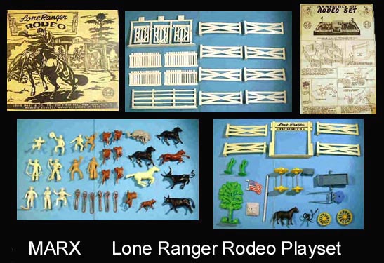 SORRY SOLD - Marx Western Ranch Set. Circa 1951-53 Boxed Bar-M ranch with metal Bar-M cabin. + rubber like vinyl and hard plastic pieces. Set has hard plastic Bar-M gate, 22 fence pieces, 12 pieces inside furniture (+ PVC stove pipe), 12 pieces outside accessories (making 9 assemblies), scraggly tree, & cactus. In rubber like vinyl there are 9 figures (I added the gunslinger so you would get all 8 poses) + 5 animals. Has instructions as well. Missing are the paper bags that some of the items would have come in.