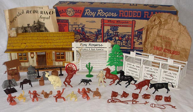 SORRY SOLD - Marx Roy Rogers Ranch 3990 playset. Circa 1953. Set appears to be complete with perhaps extra fence pieces. Has litho metal cabin. In hard plastic there are; the Roy Rogers gateway, 24 pieces of white fence, 8 piece rodeo chute, 12 pieces outside accessories (making 9 assemblies), red wagon wheel, cactus & A tree. In rubber like vinyl or soft plastic you get; Roy Rogers standing with pistol, 8 ranch cowboys, 6 sets saddle & reins, 1 set PL-325 horses; bucking & rearing horses + calf no brand, 1 set PL-460 animals; 2 stopping (bracing) horses + 1 longhorn & 1 shorthorn steers. You also get the string to be used as a rope (usually thrown out and missing), instruction sheet, + 4 bags (3 marked; saddles & reins, cowboys and ranch accessories). Box has dividers. A great set!