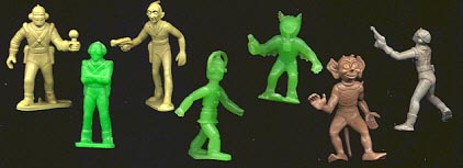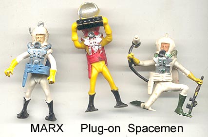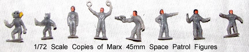 Small 1/72 scale gray copies with factory paint of Marx 45mm Space Patrol figures were made in the 1950s/60s and were sold on blister cards and perhaps in "gum ball" machines. These figures can also be found in a variety of unpainted colors.