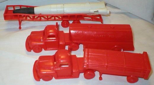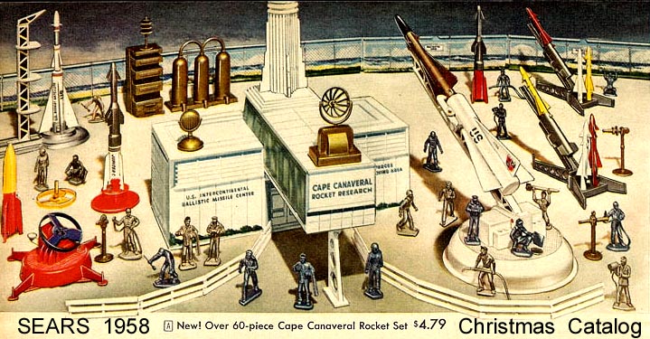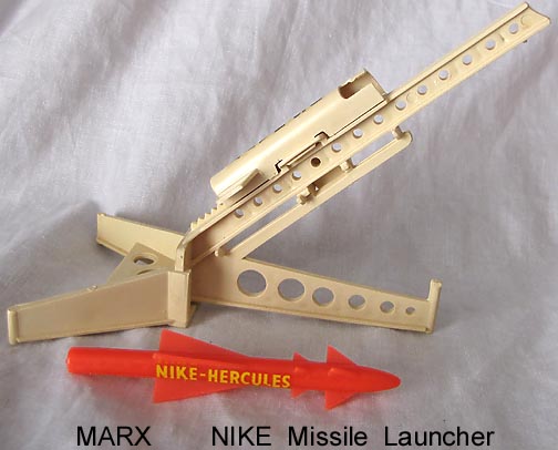 Reissue Marx Cape Canaveral playset were made in the late 1990s. More stuff than is in the picture. Three sets of 45mm airforce figures (60-66 total), bag of construction workers, two white rocket launchers with multi-piece rockets, one orange rocket launcher with 3 black rockets (NO rubber tips, 3 blue saucer launchers, gray accessories, tin building and wall with plastic top piece, decals and instruction sheet. Great Christmas present.