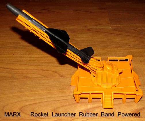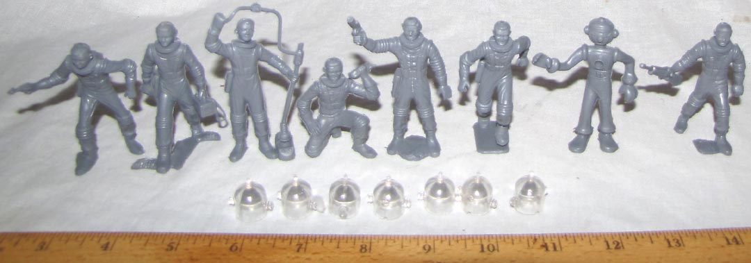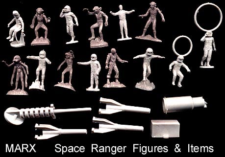 Marx reissue Space Ranger items; Fourteen 30/35mm Figures (8 astronauts & 6 aliens) + three rockets with launcher (no spring)+ two other items (I am not sure of their use). A mix of off whites & grays. Pretty much the same figures as the Marx Mystery ship figures except the two astronauts with big hoops on their heads. The reissue assortment varies from bag to bag.