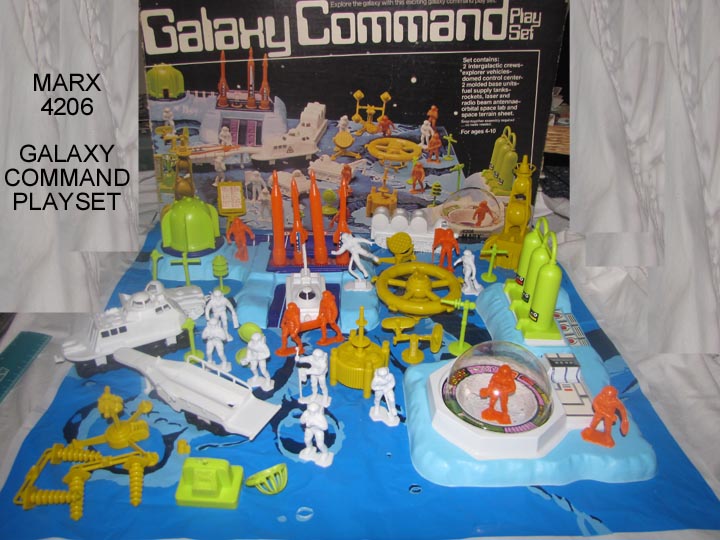 4206 GALAXY COMMAND boxed playset from the final year of Marx (1979. Looks to be near complete. There is a small crack in one of the vacuform pieces (see picture) and damage to three hard plastic pieces; trailer has railing split on one side and the disc helical radar antennae and the standard radar have broken attachment pegs. Box is a C6-7 and has insert.