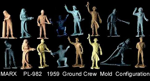 This mold was made in 1961. PL-1120 had 16 cavities that included two different 2pc "bell" suits + 12 figures in 9 poses with three of the poses in duplicate. The seated figure was also used in the space capsule mold (PL-1119) and the pointing astronaut was put into the revised ground crew mold about 1961.
