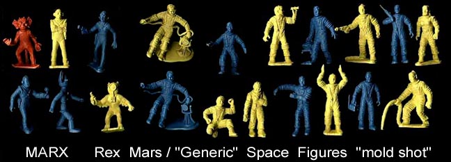 Six of the seven (except crawling pose) were included in the Generic "Rex Mars" mold. The big ears and face mask poses were also found in the Space Patrol mold, and the big ears and crawling poses were in the Tom Corbet mold. So the crawling figure seems hardest to find and the big ears figure the most common. Soft Plastic (polyethylene) figures have bases while earlier rubber like vinyl can be found with and without bases.