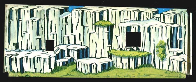 Marx made a small "exploding" mountain for their WWII playsets which were made in brown hard plastic. it was then used in the Moon Base playsets in light green. Picture above shows both versions (MISSING TRIGGER). It was reissued without a spring or trigger in the 1990s in a bronze color.
