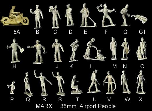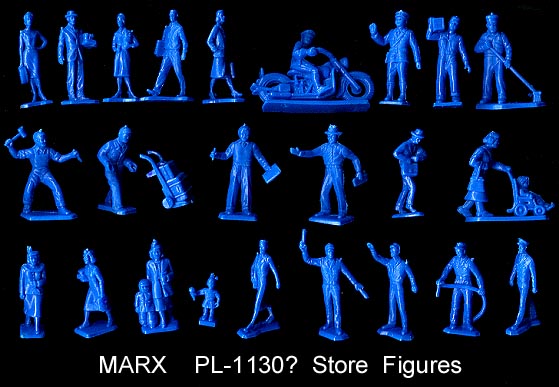 10.00 Marx RECAST PL-1130 (we think) Store People; 24 35mm Figures + dolly in blue or gray. The first five in the top row are not airport figures so we think Marx borrowed the other poses from their airport figure mold and added them to these new five poses to make their store people. We would have replaced the man with batons with the newsboy. (3 GRAY IN STOCK)