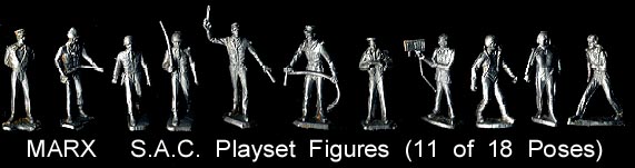 For their S.A.C. Playsets Marx borrowed figures from other sets, reducing some from 45, 54 and 60mm sizes down to the smaller 30mm size. This allowed them to fit in better with the even smaller scale planes. They can be found in silver and blues.