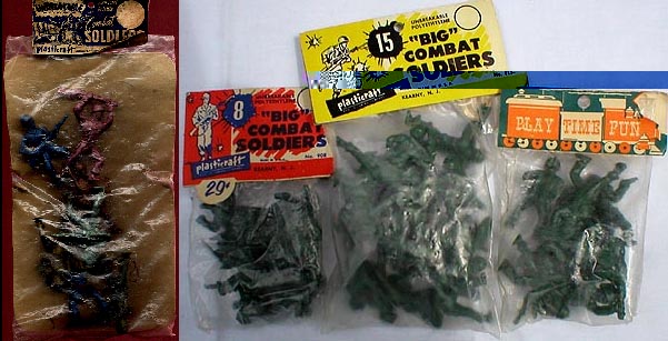 These figures were made for Archer in the 1952/53 time frame. They had them made in metallic green hard plastic for their space sets. They were also sold separately in small boxes in army green hard plastic and it seems some in soft plastic as well. When Archer decided to quit selling toys and work on child guidance/educational products in the 1956-63 time period they sold the mold to Plastic Craft (Plasticraft)who made the soldiers in soft plastic. Older figures were made in silver, other metallic colors, tans, browns, red and yellow. Later figures were made in army greens.