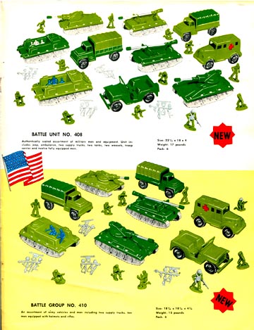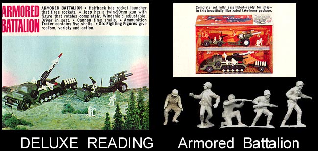 1964 Deluxe Reading catalog pictures show the exciting Armored Battalion. It was part of the "Johnny Seven""Topper Toys" line up by Deluxe Reading. Of interest it appears that the figures were not ready when the catalog was made and three MPC ringhands can be seen in the photo.