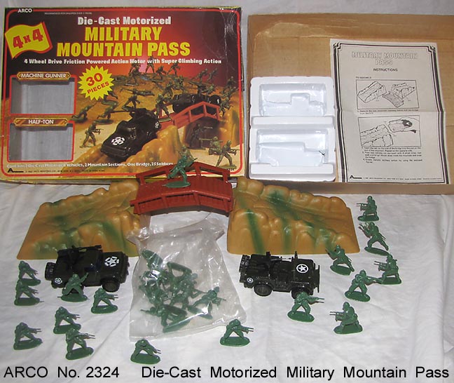 2324 Die-Cast Motorized Military Mountain Pass playset. Never played with, box top has one split. Made in 1982. Contains; two die cast motorized vehicles, 2 hard plastic mountain sections, soft plastic bridge and about 25 soldiers (45mm knockoffs of Airfix WWII GIs). Has instructions.