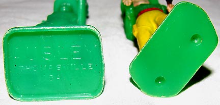 In the early 1950s, Ausley made hard plastic cowboys with clip on swivel arms. They come unpainted and have rectangular bases marked AUSLEY. Larger figures have also been found and we are unsure if they were also made by Ausley. These figures have an arm assembly that plugs together that also swivels. They come factory painted and have more oval bases with no markings, but with only two mold ejector pusher pin holes