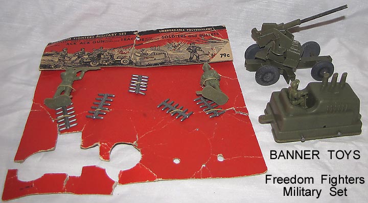 Freedom Fighters Military Set, carded bagged set (taken out for picture), AA Gun & tractor are Banner. The two soldiers are Bergen which was taken over by Banner in 1958.