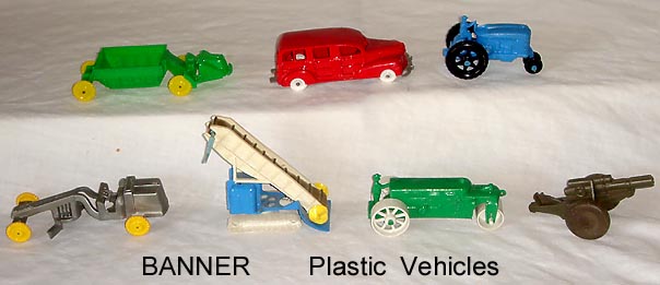 Army truck, hard plastic body with tin top and hard rubber wheels. Cannon is hard plastic with wooden wheels. Both pieces have the Banner logo. About 45mm in scale.