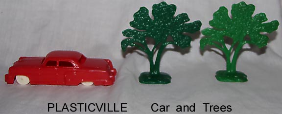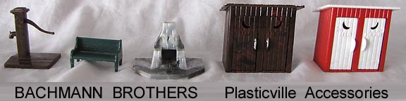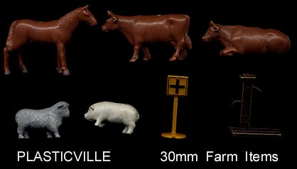 Bachmann made a line of buildings and accessories tio go with their trains called Plasticville. The Plasticville range covered a wide range of "O" scale buildings for model train layouts. Animals are about 30mm in scale. Made of hard plastic