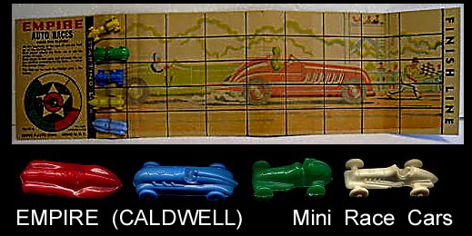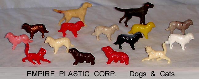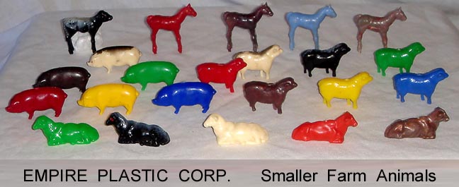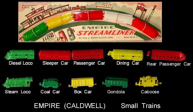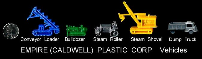 In 1946 Caldwell Molding started up in Canada. By 1948 they had moved to the Bronx in NYC and then to nearby Pelham Manor around 1955. They made molds for others and also for themselves with their primary business of making plastic buttons for clothing. They also started making molds that made small toys. They set up a subsidiary, Empire Plastic (New York is the "Empire state) to sell the toys they were making. They made all sorts of small vehicles as well as farm animals. They made the mold making the hollow belly animals Ohio Art used in their farm playsets. In 1960 they were sold to Carolina's Enterprises and moved to the Raleigh Durham area (Tarboro) of North Carolina. There they made a line of 3 inch jointed western figures sold on blister cards that competed with Marx's similar line. They also started making blow molded Halloween and Christmas decorations that would light up and be used inside or out. In 1976 for the Centennial they made a set of six inch figures. There were 8 figures, 5 colonials and 3 Indians. A few years later they made the four space figures during the Star Wars craze. When Marx went out of business in 1979 they bought the tooling to make the "Big Wheel" tricycle but it seems the toy range was phased put in the 80s. They became part General Foam Dynamics in the 1980s who went out of business in the late 1990s.