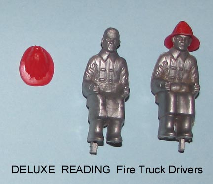 The firemen on foot pictured below were sold with firetrucks made by Deluxe Reading and Eldon. Obviously based upon the MPC ring hands the actual maker is unknown. The white accessories are very similar to the ones made by MPC and the ones pictured below came with a Deluxe Reading firetruck but we can't be totally sure some were not made by MPC. The Deluxe Reading fire truck drivers are silver and have clip on red helmets. The Eldon drivers were also made in a silver color but their helmets are molded onto the heads. Foot pegs for Deluxe Reading truck attachment are often missing or short.