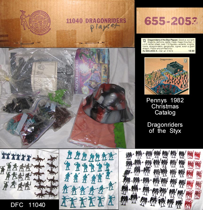 11040 Dragonriders of the Styx playset; Sold in 1982 from the Pennys Christmas catalog whose catalog item number 655-2053 is marked on the plain box twice. The castle with instructions, playmat and large dragon are still in their factory sealed bags. The other figures have been taken out of their bags but look unplayed with. The printed paper above the two piece vacuform mountain lists the figures you should receive. There was one fewer gargoyle, but two extra demons, one extra knight and one extra titan for a total of 115 figures. Penny's catalog information and pictures courtesy Joseph Svec.