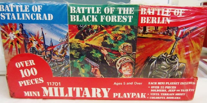 Pack of three 1/72 WWII playsets as seen above. Each set has 35 pieces including soldiers a tank or jeep and a vinyl playmat. Dated 1983 and made in Hong Kong.