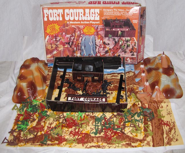 In the early 1980s DFC made a series of playsets. The prehistoric set came with a heavy vinyl playmat, three vacuform "mountains", cardboard raft and a nice series of 45mm cavemen compatible with Marx, a series of smaller animals mostly copied from Processed Plastic (Tim-Mee) and a double set (12 animals) of copies of Sinclair dinosaurs. The Sinclair dinosaur mold was made in 1964 for the Sinclair Oil Company who sold bagged sets of these dinosaurs at the 1964 World's Fair. The "Sinclair" dinosaurs are also compatible in scale with Marx. All in all a nice set if you can find one.