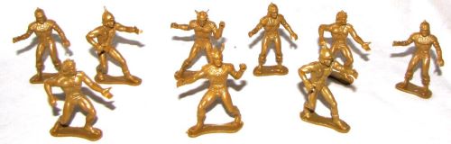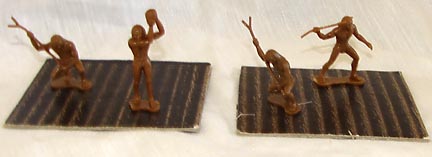 Made in Hong Kong for DFC. The above picture shows one butterscotch and five cream cavemen made by Marx and the five dark brown cavemen made by DFC. As you can see the DFC figures are compatible with Marx figures.