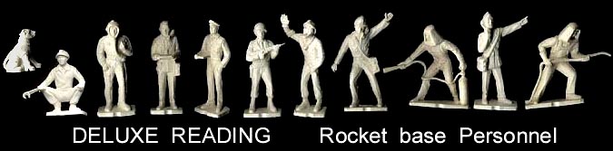 We know of at least 11 human figure poses made for the Deluxe Reading rocket base playsets. Not included in the above photo is the Astronaut in seat for one of the space capsules. Also made to ride in one of the three space capsules were a dog and a monkey. The third capsule held equipment.