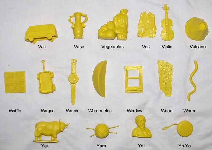 After the Russian Sputnik was launched powers that be panicked and went around trying new ways to give children a better education. Houghton Mifflin along with a group of college professors developed these plastic objects to be used with a Kindergarten program "Getting Ready To Read" to help children learn consonants. Developed in the mid 1960s the 88 objects were first made in red. In 1981 the set was revised, enlarged and the now 114 plastic objects switched from being made in red to yellow.