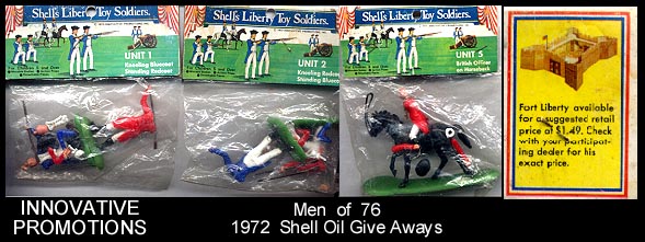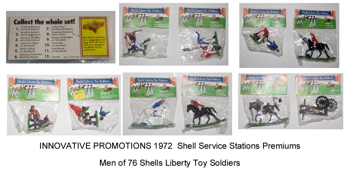 After LIDO was sold one of the owners, Effram Arenstein along with the man who made Raggady Andy dolls set up Toy Innovations/Innovative Promotions in Hong Kong. Among the products they made were copies of Timpo's swoppets. In 1972 copies of Timpo American Revolution figures were used as give aways at Shell gasoline stations. These same figures became more popular when sold on blister cards during the bicentennial of 1976 and to collectors they are called "Men of 76".