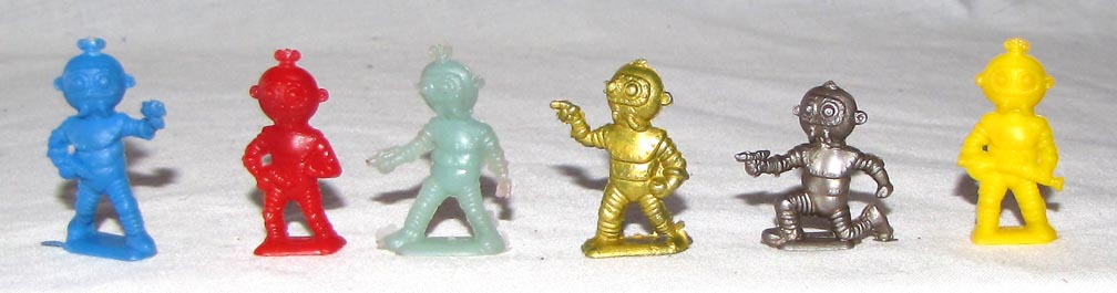 These spacemen are pictured bigger than actual size (about 1 inch high). They were also made in a larger scale by Coma of Spain (or Italy). These may have been made in the US and copied by Coma (or vice versa). They date to the 1950s.