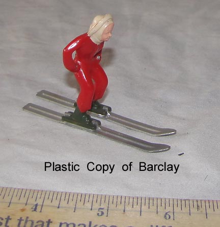 - Hollow plastic copy of Barclay skier, NO SKI POLES.