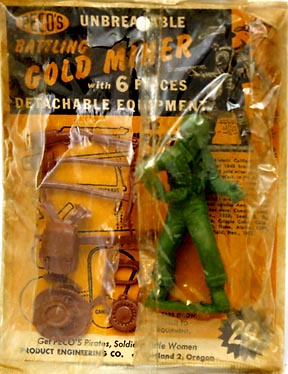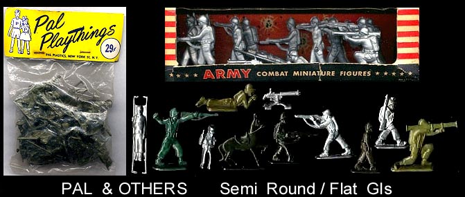 O'Brians COLLECTING TOY SOLDIERS #3 has these shown as; "Kilty Soldiers made by Bonnie Bilt" of New York. These GI flats come in two sizes. With the exception of the mounted pose which we have seen only in the small size all poses are found in both sizes. Both sizes can be found in both hard plastic and soft plastic. The hard plastic figures are shades of green while the soft plastic figures are silver. PAL sold hard plastic versions in header card bags as seen above. REMCO included them with some versions of their Bulldog tank. The open window boxed set pictured above contains soft plastic figures but has no manufacturers markings. We believe multiple companies were involved in either the manufacturing or sale of these figures. As Bonnie Bilt was the first to make them individual figures will be listed at the Bonnie Bilt page (All other A-O makers).