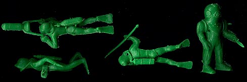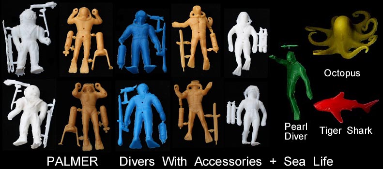 The Palmer diver and sea life set is an interesting group. There are; 4 SCUBA divers, 1 deep sea diver, 1 pearl diver, 1 shark and 1 octopus + 12 small accessories in the set including one tiny fish. The accessories come attached to the body of the diver they go with, and many have been lost over the years making them extremely difficult to find. The divers often have mold holes due to poor manufacturing
