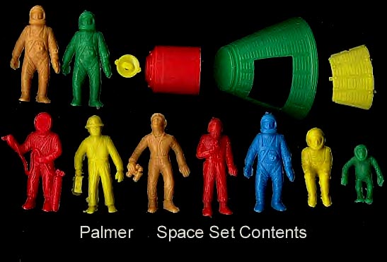 This set was sold on a blister card. The one example we have seen had the pieces split into 3 different colors with pieces still attached to the sprue tree runners. The set consists of a four piece space capsule (3 pieces in one color 4th piece (door) sometimes in another color) and 9 figures in 7 poses. There were three of the astronaut walking (in different colors in the one set we have seen) + one each of the space chimp and other five human poses. Made in soft plastic, the set was run in blue, green, red, yellow, white and tan colors. The space capsule does not have a bottom and we think that perhaps the original plan was for it to be similar to the Marx capsule with a place to seat the sitting astronaut (who now has no where to sit in this set).