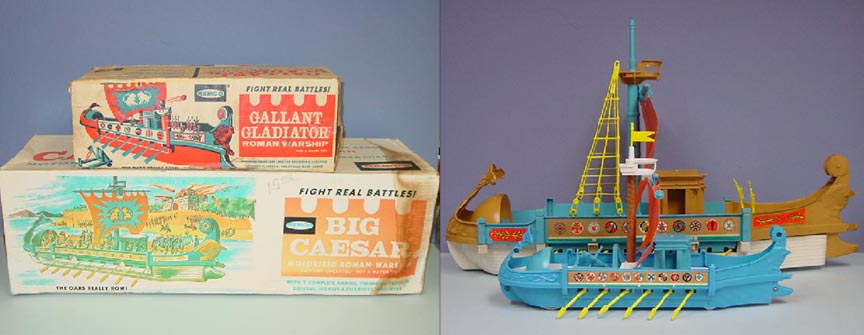 Remco made a nice pair of ancient Roman ships. The Big Caesar was battery operated to roll along the floor with the oars "rowing". The smaller Gallant Gladiator was not battery operated but also had wheels and the oars would "row" when you pushed it. The ships came with a nice complement of 45mm Romans with a chariot + shooting catapults. Picture courtesy David Schafer.