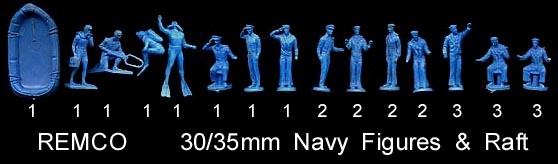 These figures were used in both the Mighty Matilda aircraft carrier and Barracuda submarine sets. They were produced in sets of 25 pieces with one raft and 1-3 of each figure pose as shown above. The sub got one set and the carrier got four sets.